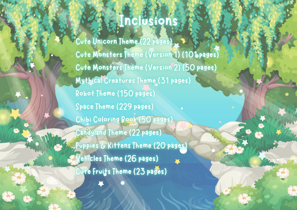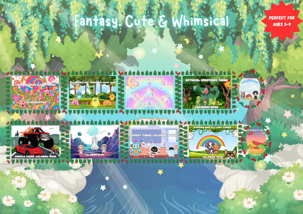 Cute Unicorns, Chibi Characters & Candyland – Sweet, cheerful themes for joyful coloring (94 pages) Cute Monsters (Version 1 & 2) – Silly, friendly creatures perfect for giggles and imagination (151 pages) Mythical Creatures & Space Adventures – From dragons to astronauts, expand their world beyond reality (260 pages) Robot Theme – Perfect for little engineers and tech-loving kids (150 pages!) Puppies & Kittens, Vehicles & Cute Fruits – Real-world cuteness meets creative fun (69 pages)