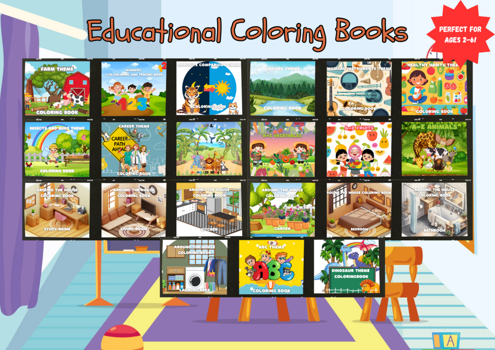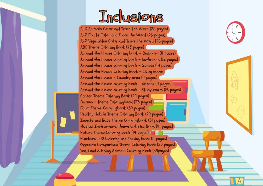 8✅ What's Inside: A–Z Animals, Fruits & Vegetables – Color and trace the words while learning ABCs (78 pages) ABC Theme Book – Reinforce letter sounds and vocabulary through coloring (78 pages) “Around the House” Series – Familiarize your child with home spaces like the bedroom, bathroom, kitchen, laundry, and more (74 pages) Career Theme – Introduce kids to different community helpers and professions (29 pages) Dinosaur, Farm, Insects, Sea, Land & Flying Animals – Perfect for curious minds who love nature and creatures (173+ pages) Healthy Habits & Opposites – Teach routines, self-care, and early thinking skills (40 pages) Musical Instruments & Numbers 1–10 – Build awareness of rhythm, math, and language (52 pages) Bonus: Nature Theme Book – Calm and simple scenes for peaceful coloring moments (14 pages)