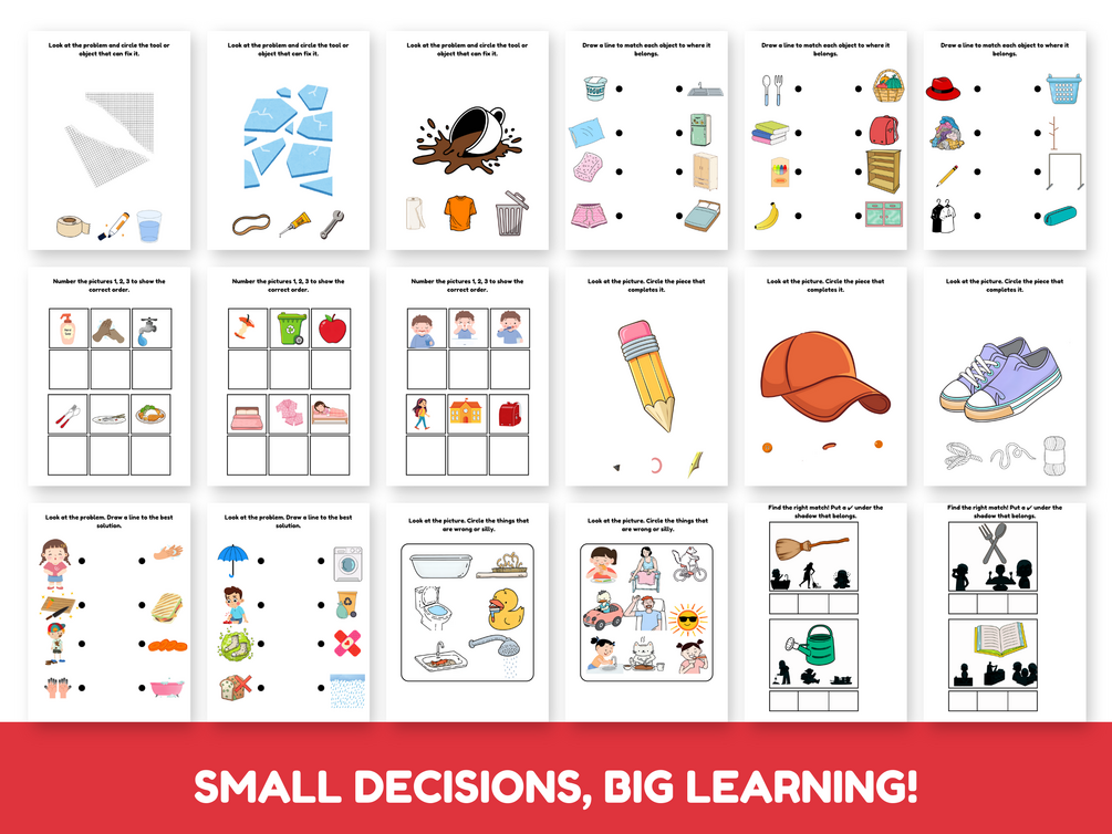 Inside, your preschooler will explore activities like Which tool should I use?, Where does it belong?, and What comes first? to understand routines and choices. They’ll build reasoning skills with Find the missing piece and Problem & Solution Match, and practice observation and logic with Find the mistake and Who does it belong to? Each activity feels like play, but strengthens critical thinking, decision-making, and everyday problem-solving.